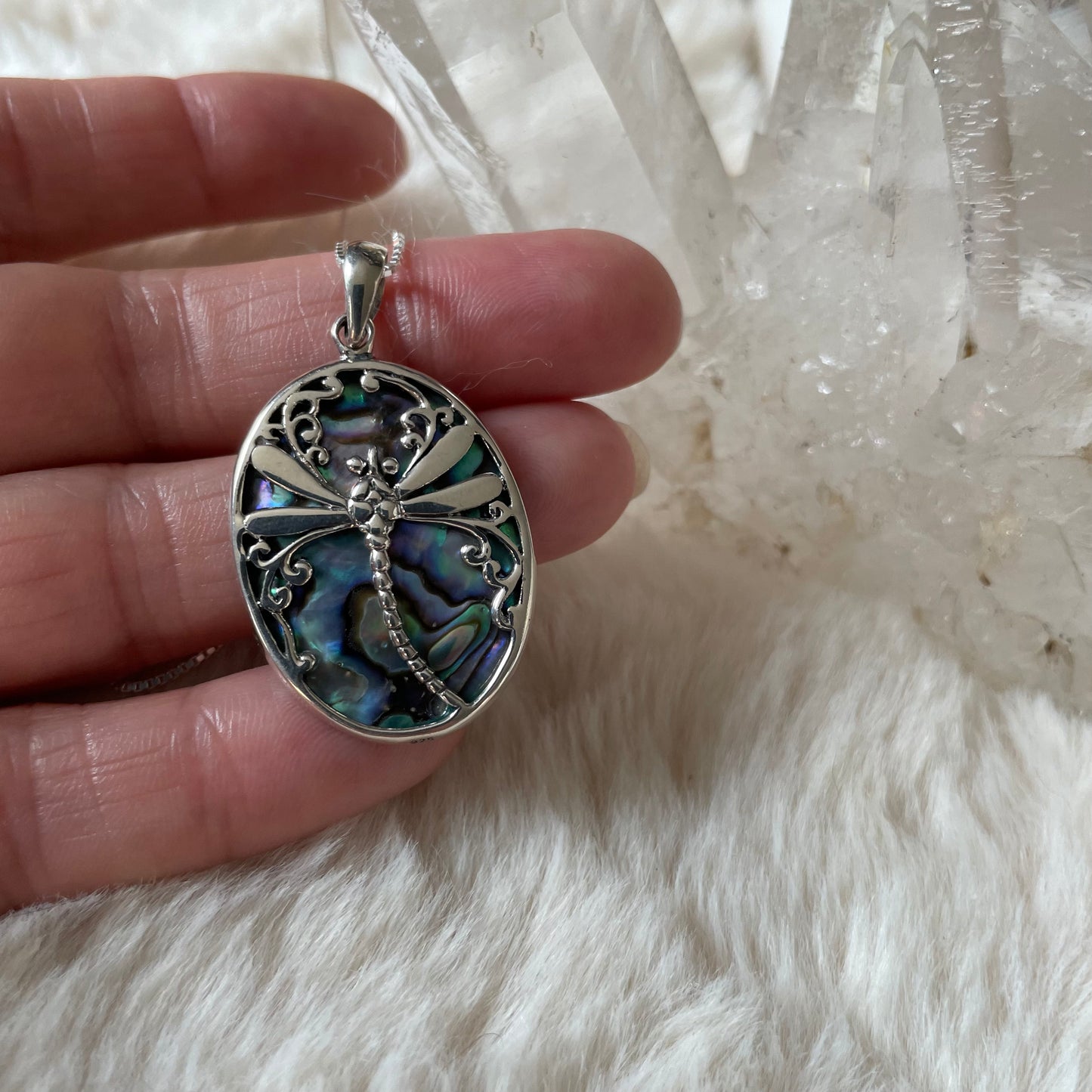 Sterling silver dragonfly pendant with abalone backdrop. Comes with an 18 inch sterling silver chain.