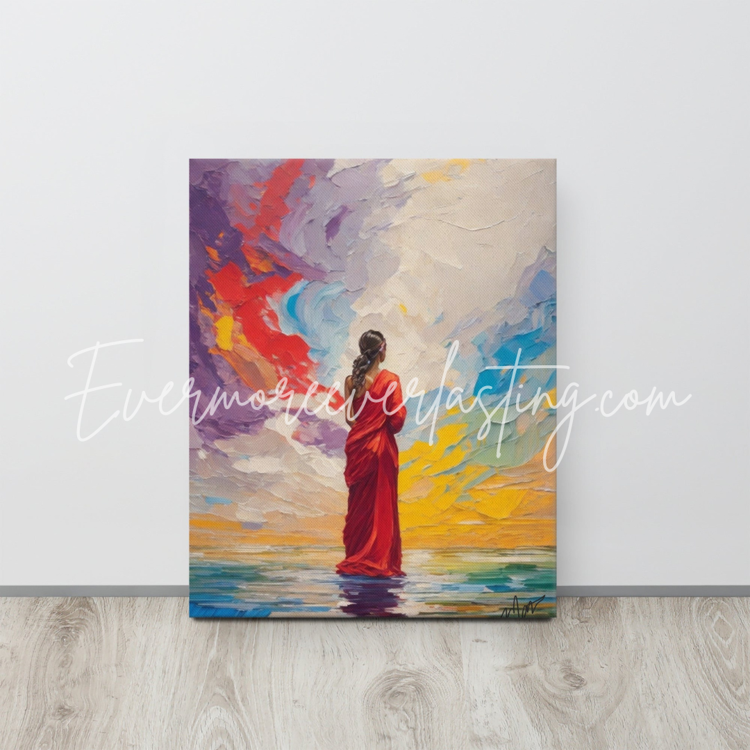 This painting captures a quiet, introspective moment as a woman stands lost in thought. Rendered in expressive brushstrokes this piece conveys a deep sense of emotion and stillness. Her gaze, cast toward an unseen distance, invites the viewer into her inner world—a space of memory, hope, or quiet strength.