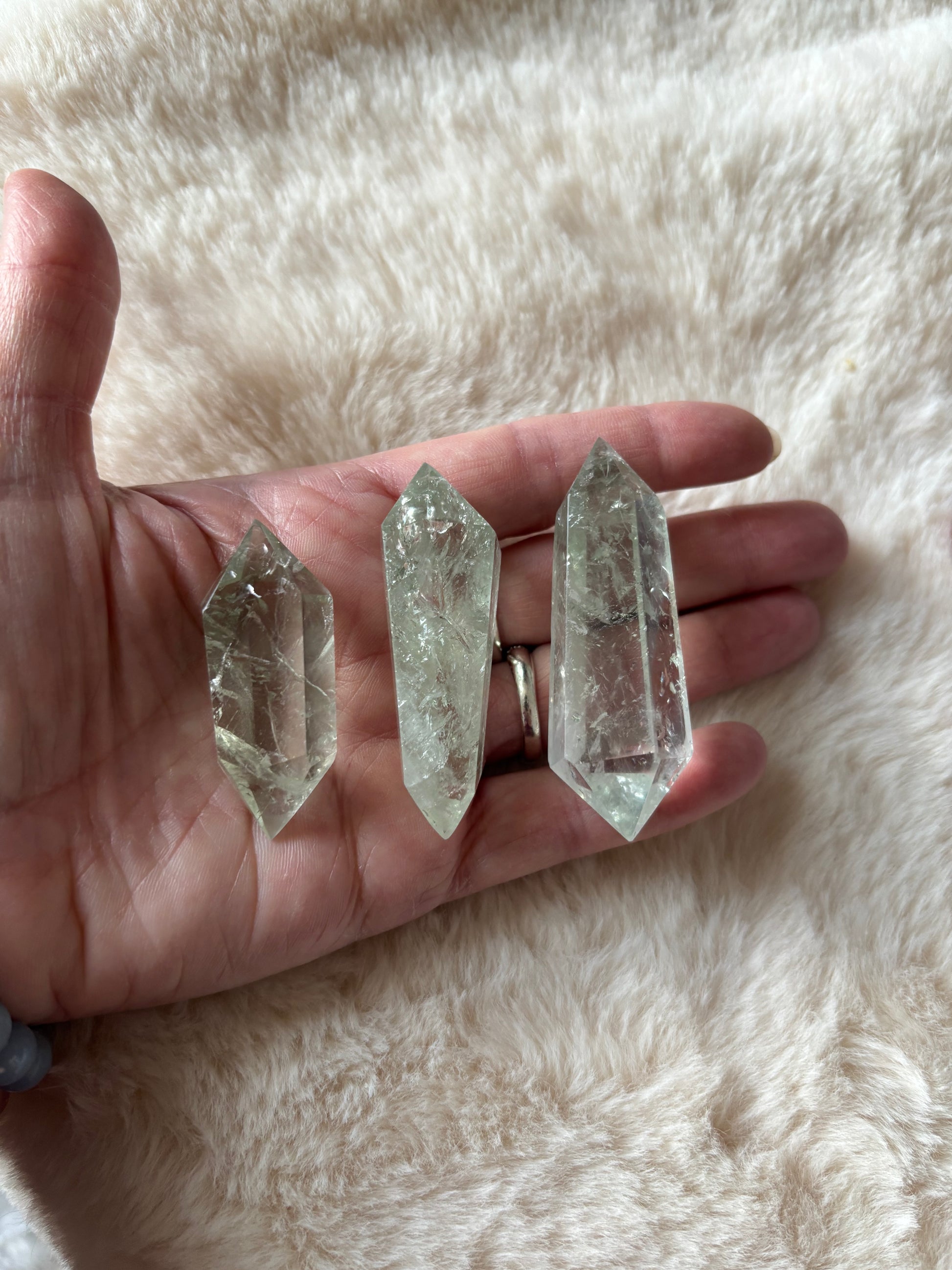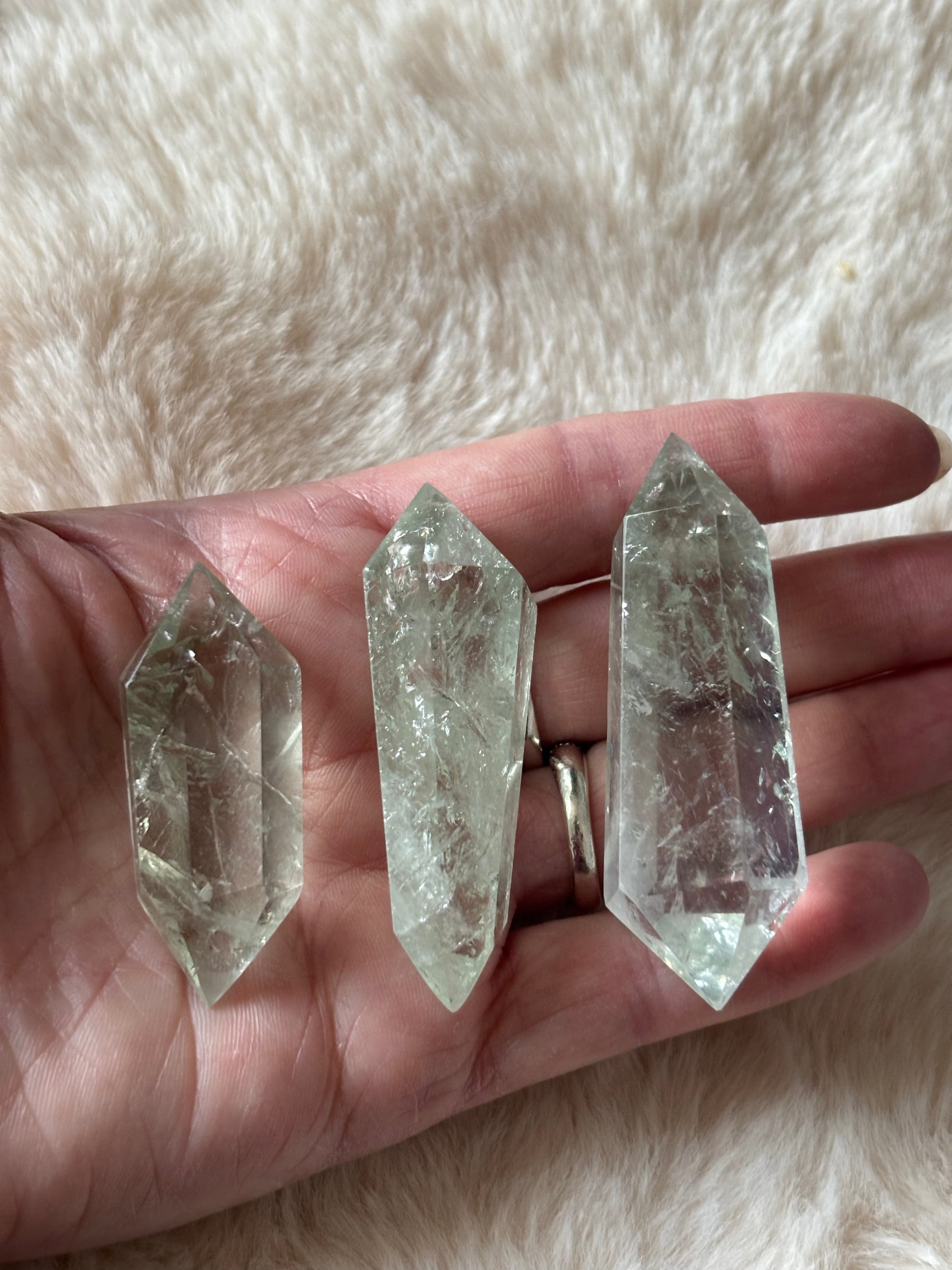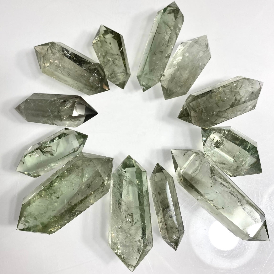 These stunning Double Terminated Prasiolite Points are a captivating addition to any crystal collection. Known for their vibrant green hues, these natural gemstones exhibit an ethereal clarity that reflects the unique properties of Prasiolite. Each point is double terminated, meaning it has two pointed ends, allowing energy to flow both ways. This feature makes them ideal for energy work, crystal healing, and meditation, as they promote a balanced and harmonious exchange of energy.