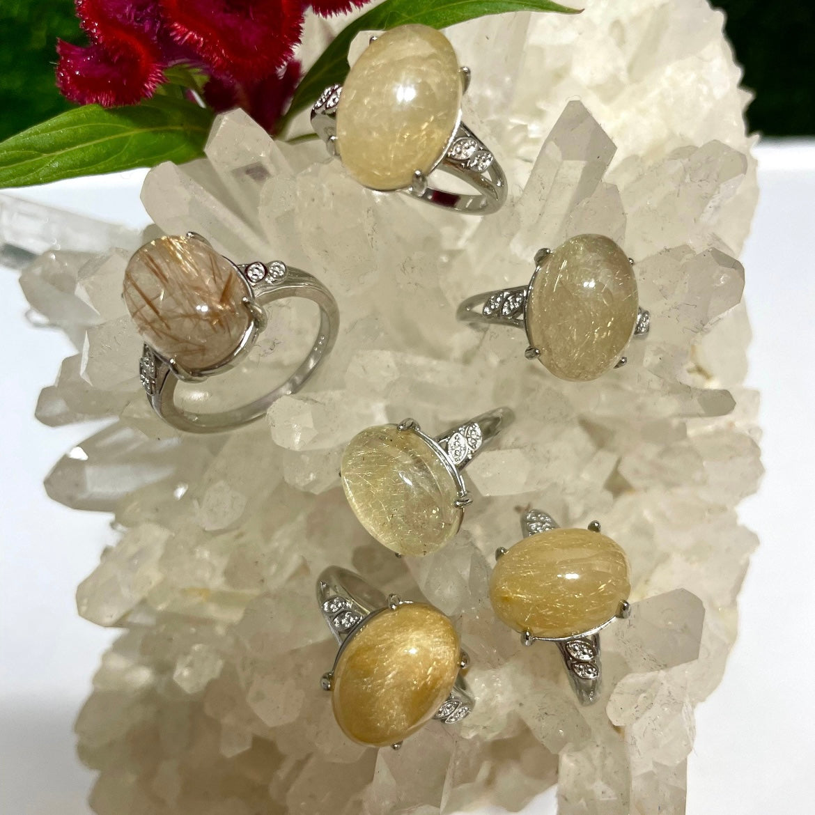 Natural gold rutilated quartz set in white bronze. Each stone is unique and will vary by size. Size of the Gold Rutilated are roughly 9x11mm each. White Bronze rings are hypoallergenic and do not contain lead.