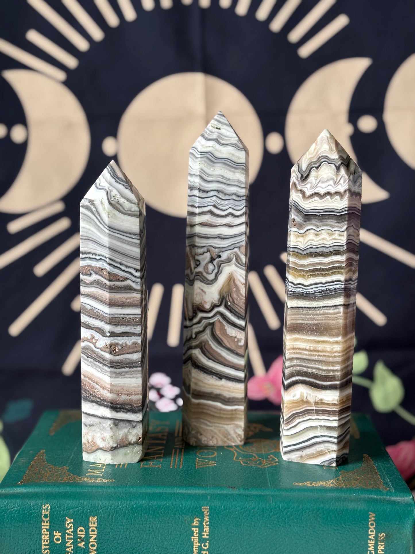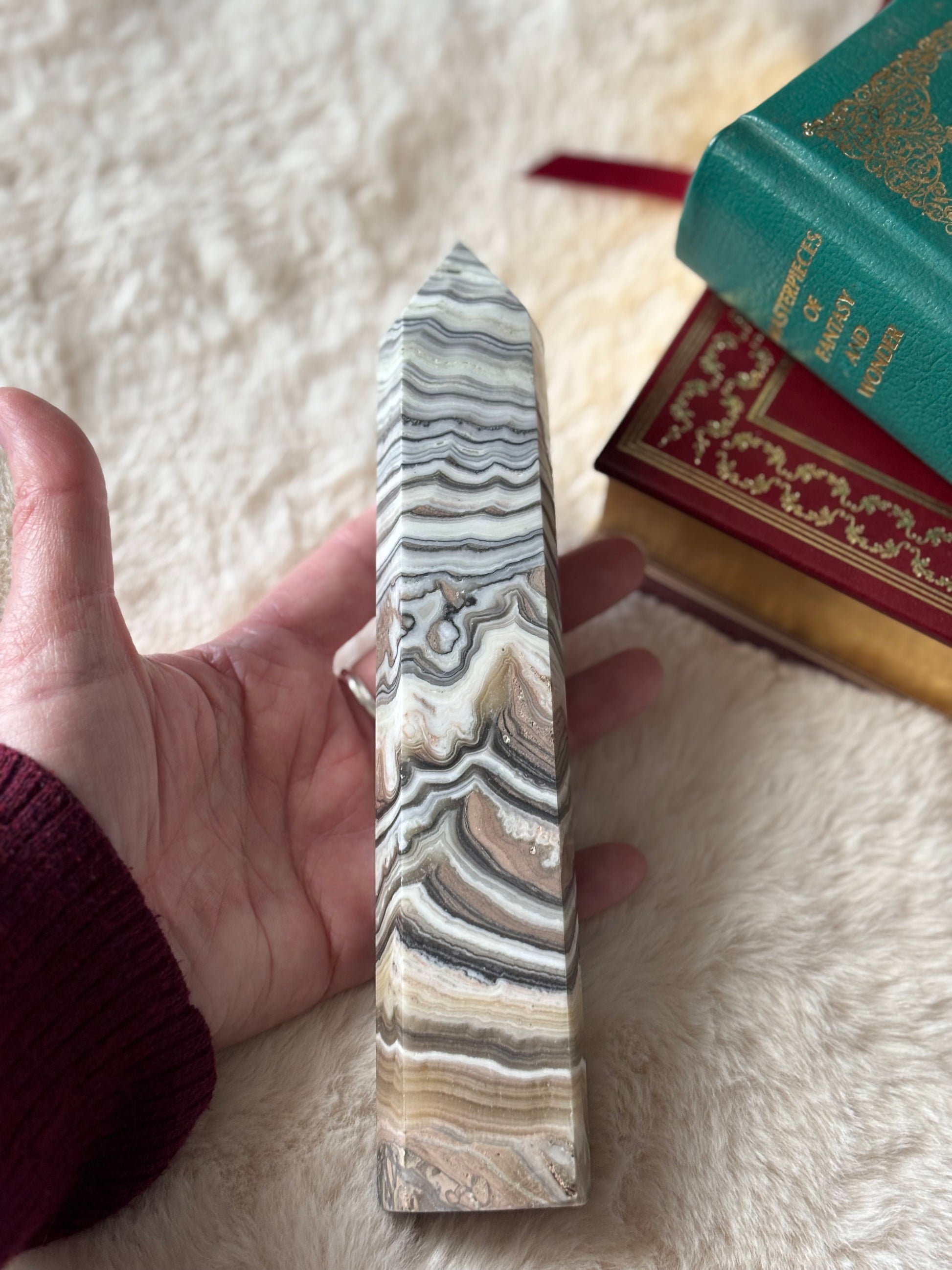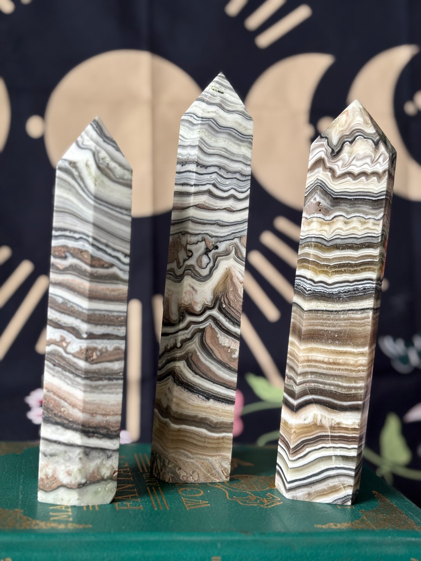 This stunning Large Zebra Calcite Tower is a beautiful natural masterpiece, showcasing the unique banding pattern that gives it its signature "zebra" appearance. This tower radiates a smooth, polished finish, highlighting the stone's intricate lines and textures. Perfect for meditation spaces, crystal collections, or as an elegant addition to any room, this striking tower stands tall and commanding, making it a powerful focal point in your home or office. Each piece is roughly 7-8” tall.
