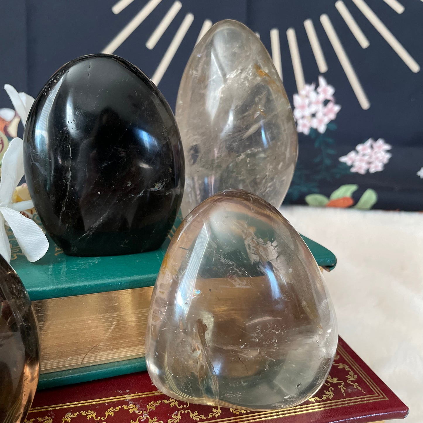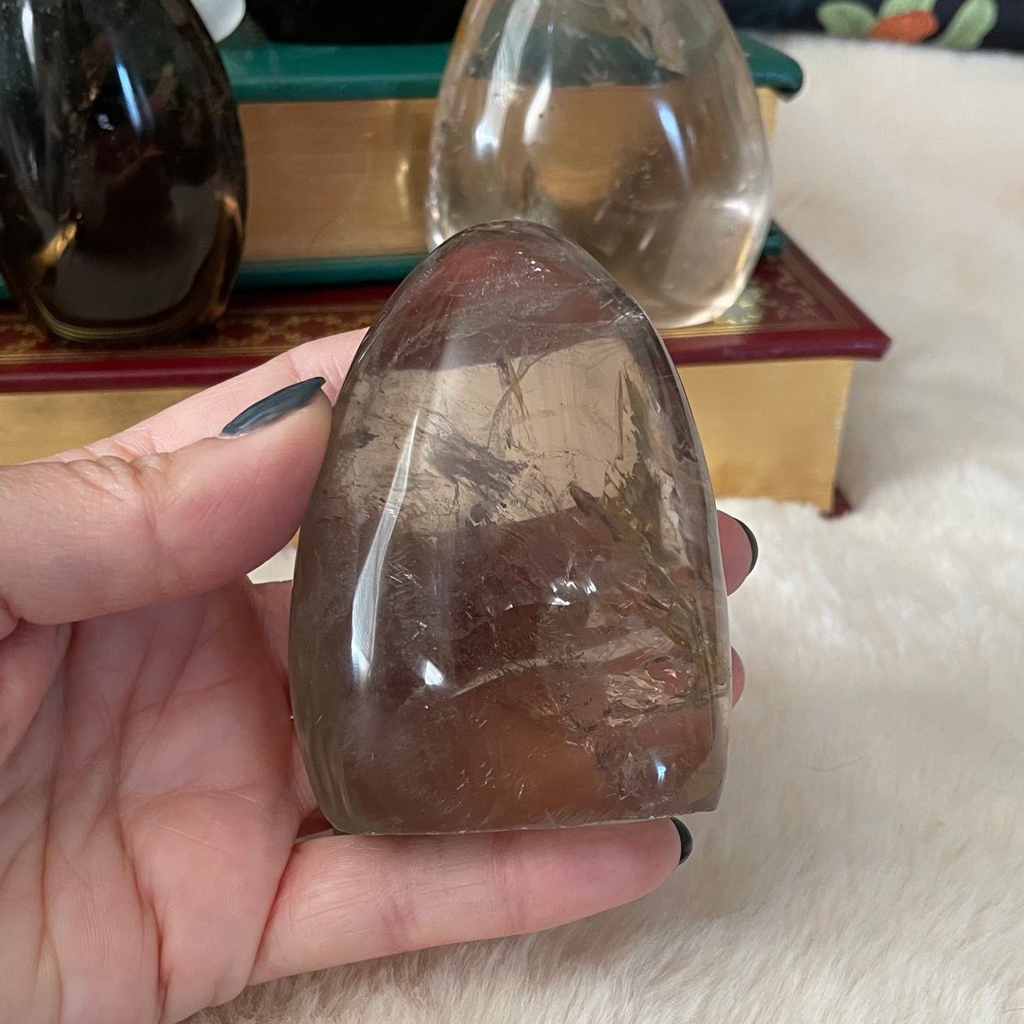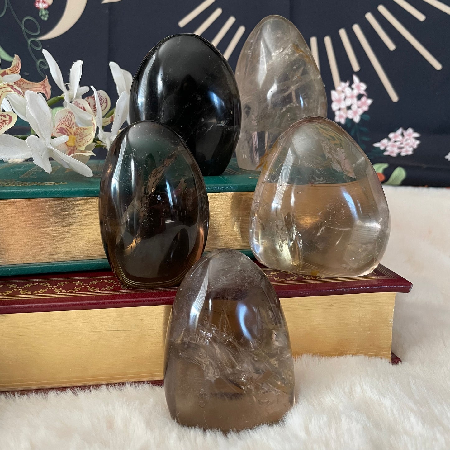 Natural Smoky Quartz Freeform. Each piece will vary due to the natural constitution of the stone. These will also range in color from deep brown to light brown. Sizes range from 3-4” in height.